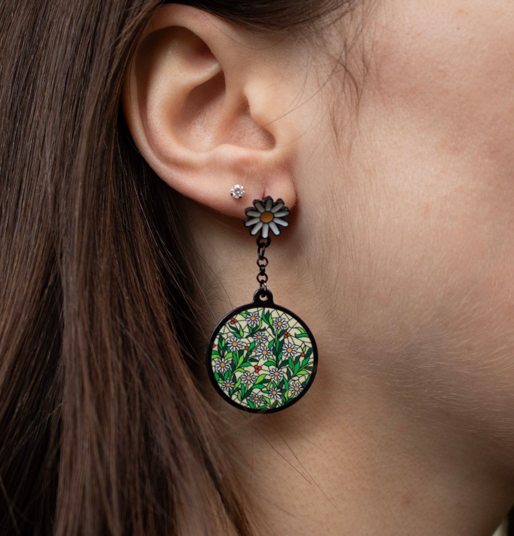 Introducing our Daisy Earrings! These earrings display a daisy on the ear with a frame of stained glass daisies dangling below. Embrace the beauty of nature with these elegant and whimsical earrings that are sure to add a touch of charm to any outfit.