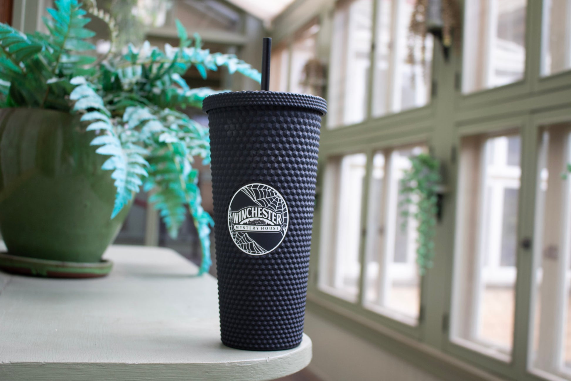 Introducing our Winchester Mystery House tumbler - a sleek black diamond cut design complete with a matching lid and reusable straw. This must-have accessory features a stylish spiderweb design, elegantly showcasing our Winchester Mystery House logo. Stay hydrated in style!