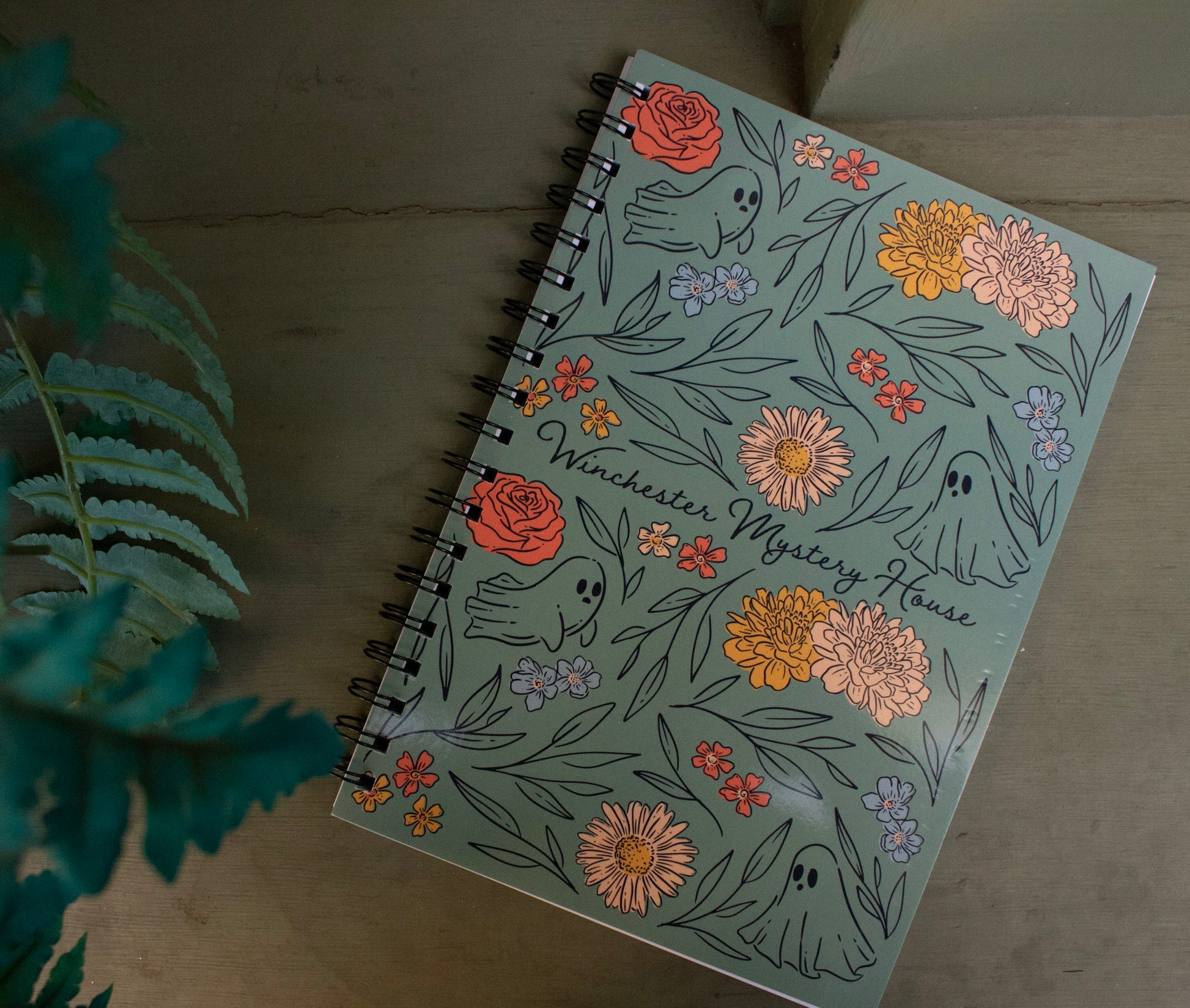 This journal cover features a ghost-floral design with "Winchester Mystery House" displayed". The perfect journal to keep track of all of your haunting thoughts.