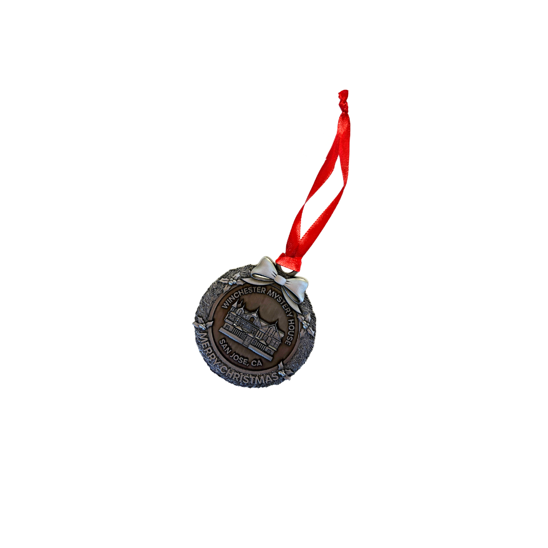 This metal ornament features a detailed, raised image of the historic mansion, surrounded by the text "Winchester Mystery House," "San Jose, CA," and "Merry Christmas." It comes ready to hang with a festive red ribbon attached.