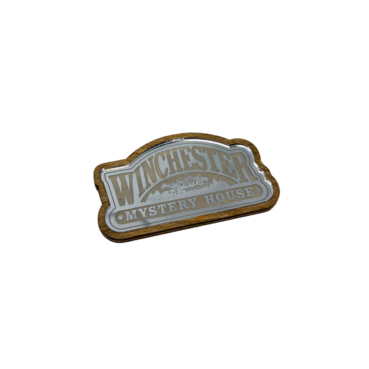 Add a touch of intrigue to your fridge, locker, or magnetic board with this unique mirror magnet. Framed with natural wood edges and featuring a subtle reflection of the Winchester Mystery House logo etched into the glass. Available in silver and gold.